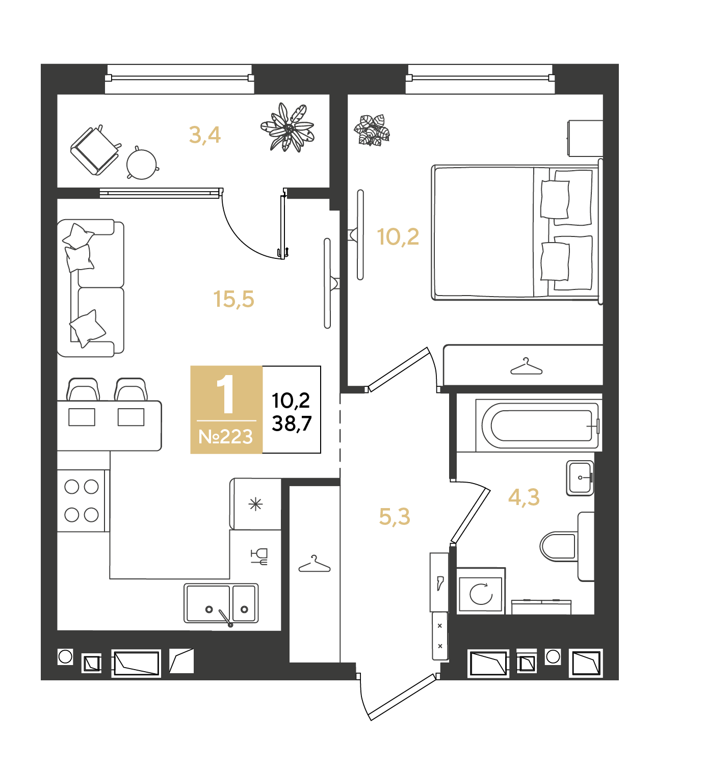 Общая площадь: 38.70м2