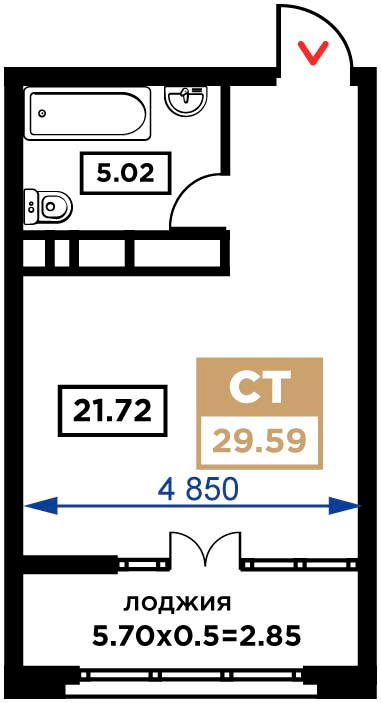 Квартира этаж 5, площадь 29.59 м2