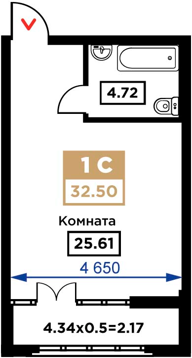 Общая площадь: 32.50м2