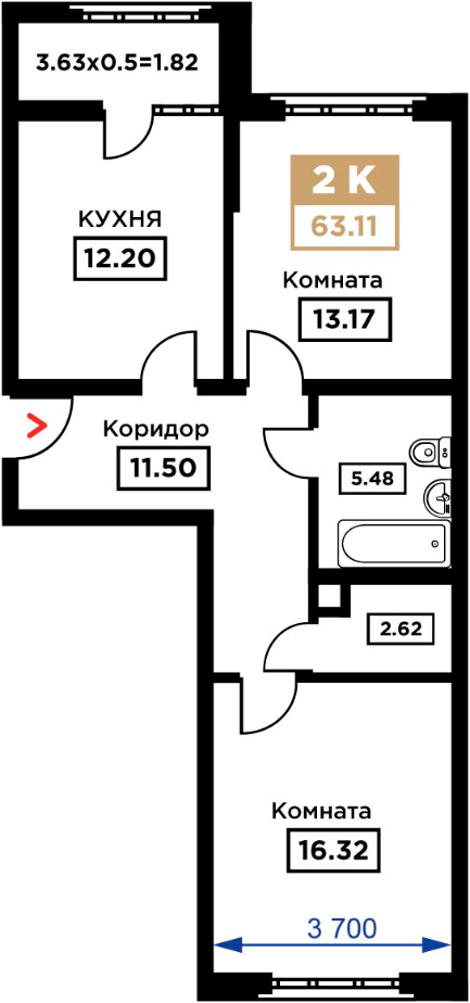Общая площадь: 63.11м2