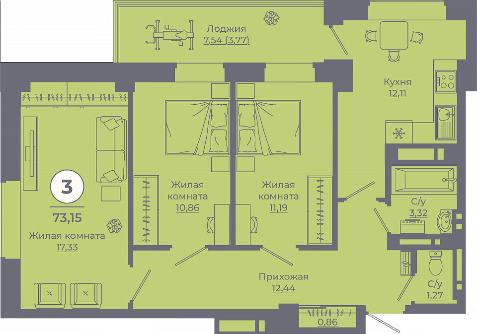 Общая площадь: 72.74м2
