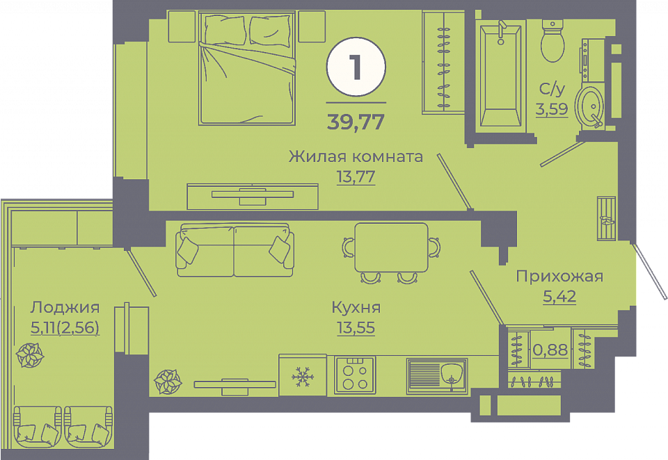 Общая площадь: 39.45м2