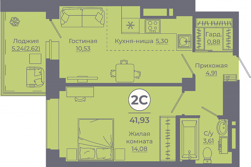 Общая площадь: 41.55м2