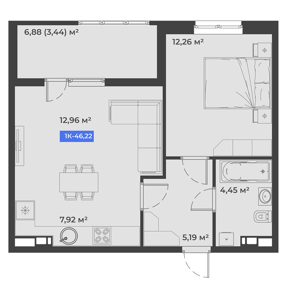 Общая площадь: 46.22м2