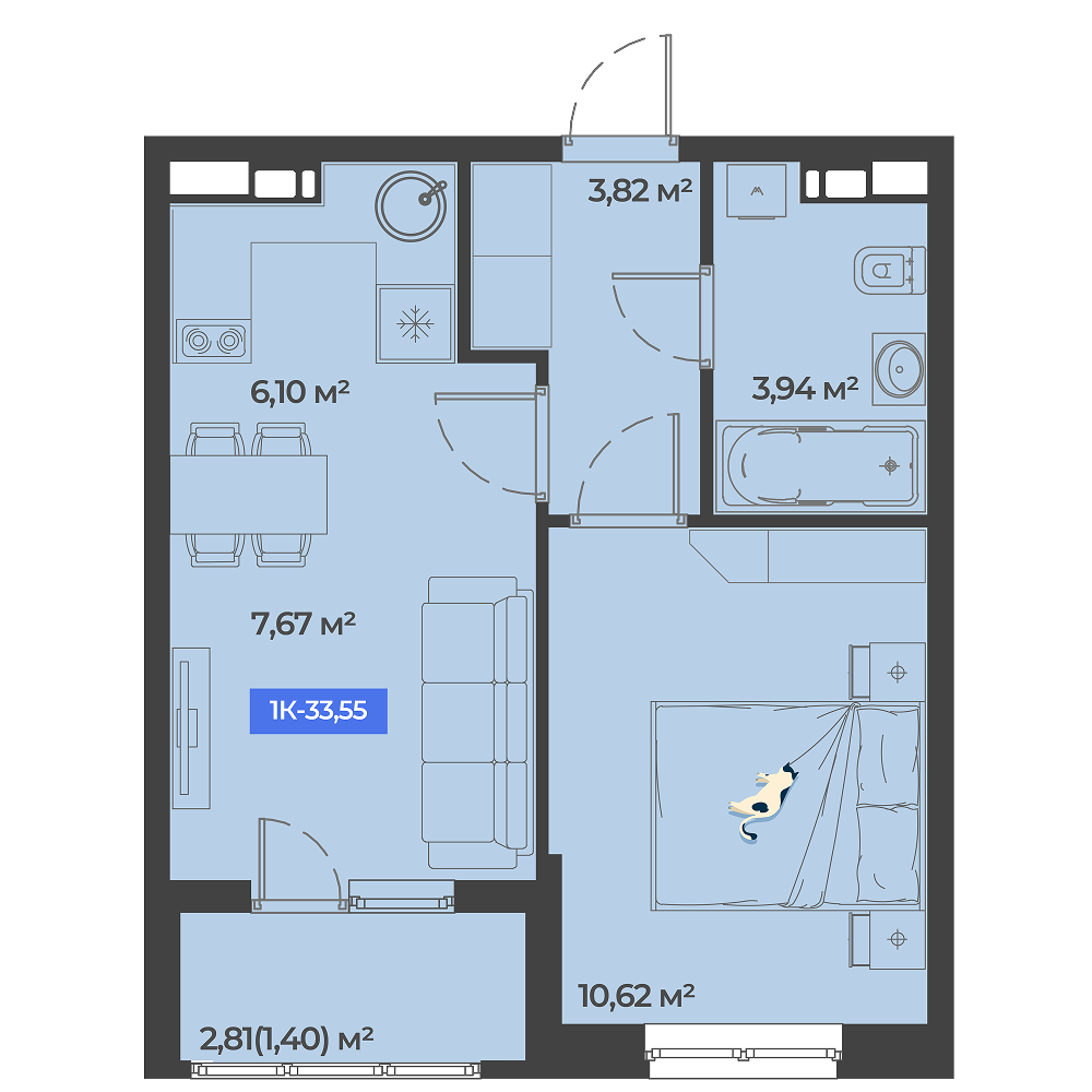Общая площадь: 33.55м2