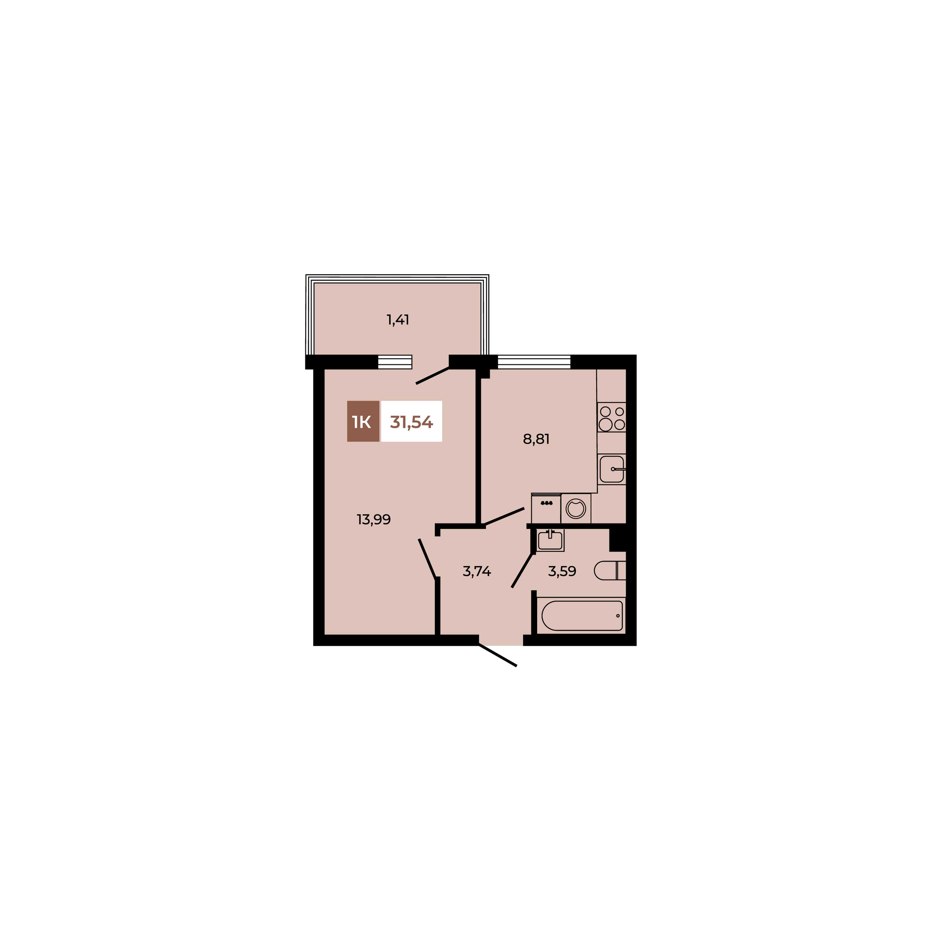 Квартира этаж 1, площадь 31.54 м2
