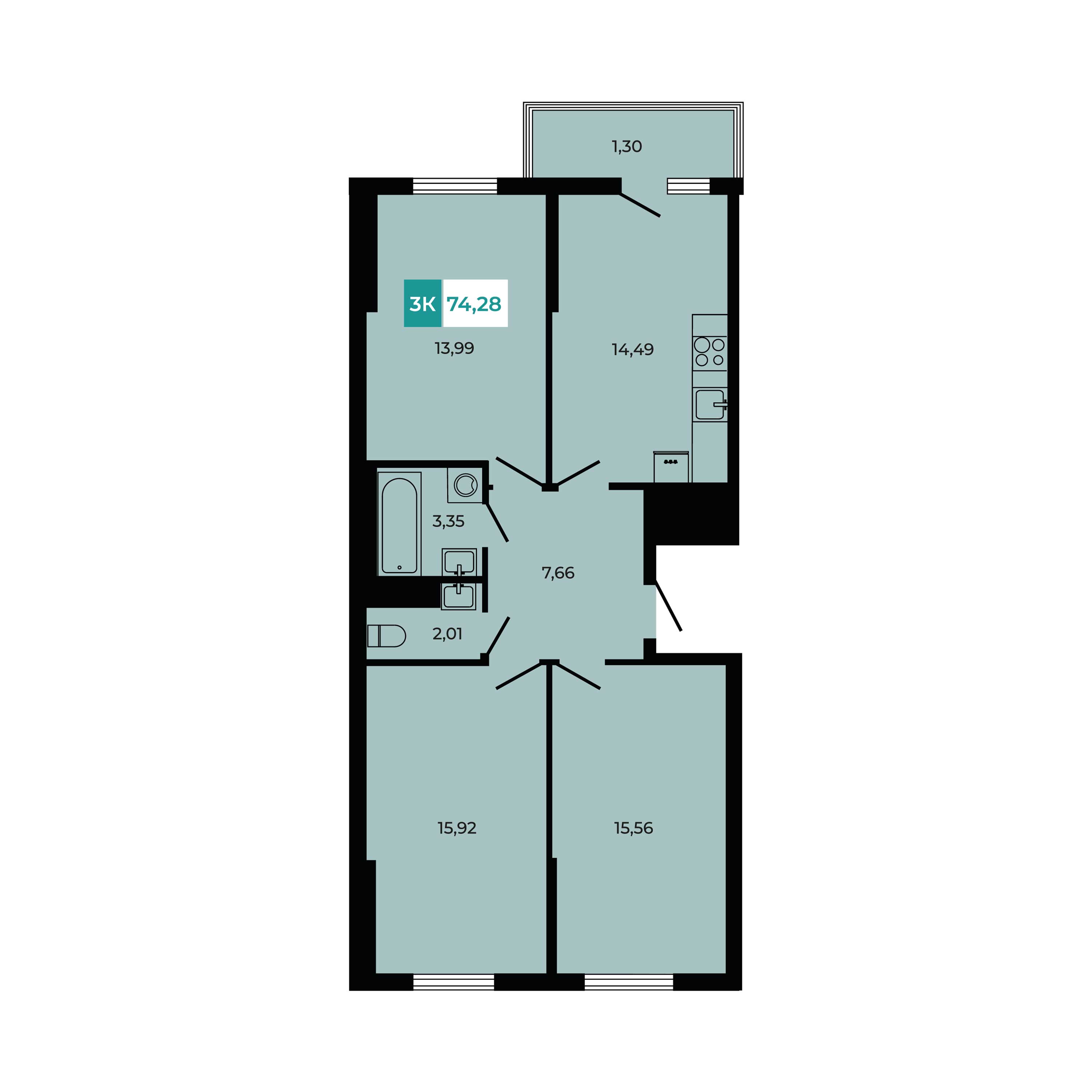 Общая площадь: 74.28м2