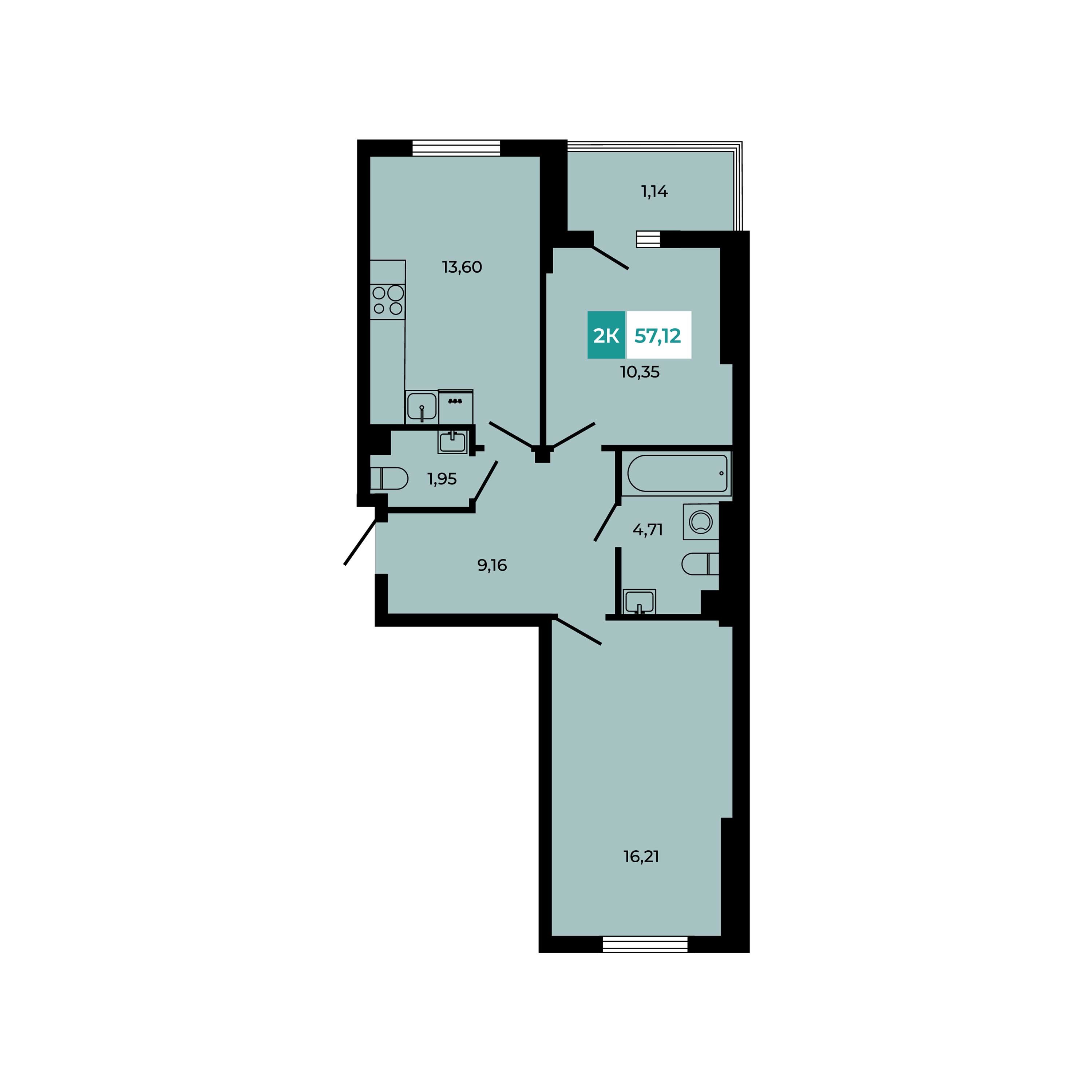 Общая площадь: 57.12м2