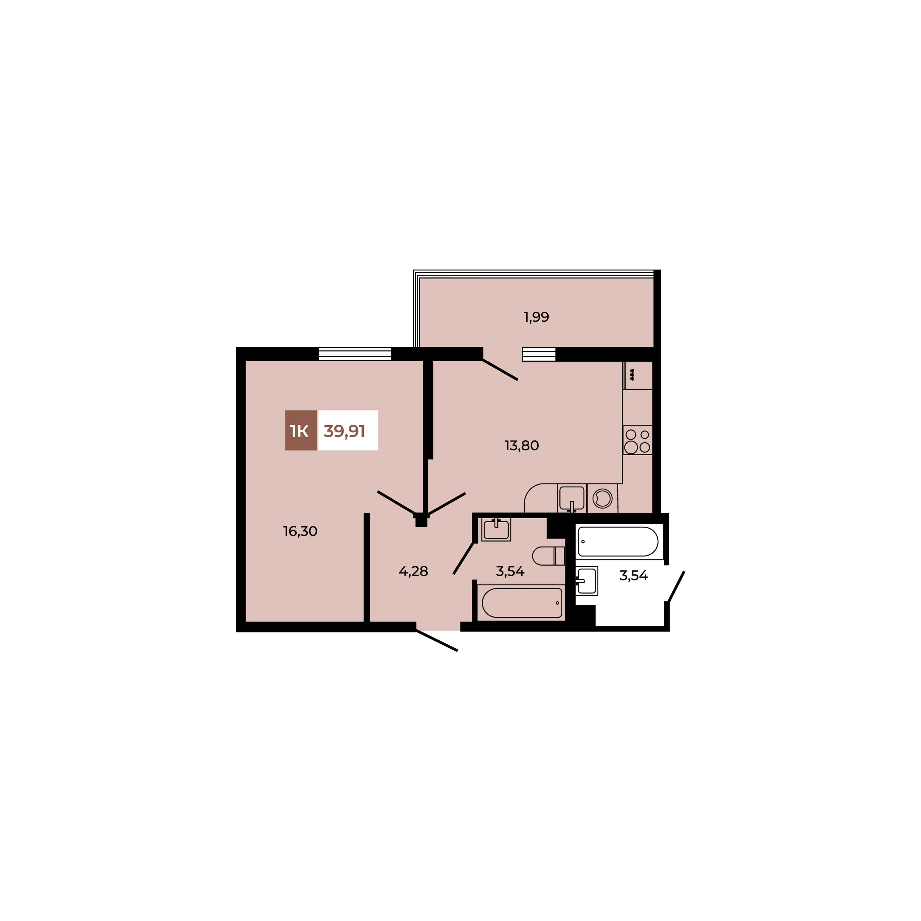 Квартира этаж 1, площадь 39.91 м2