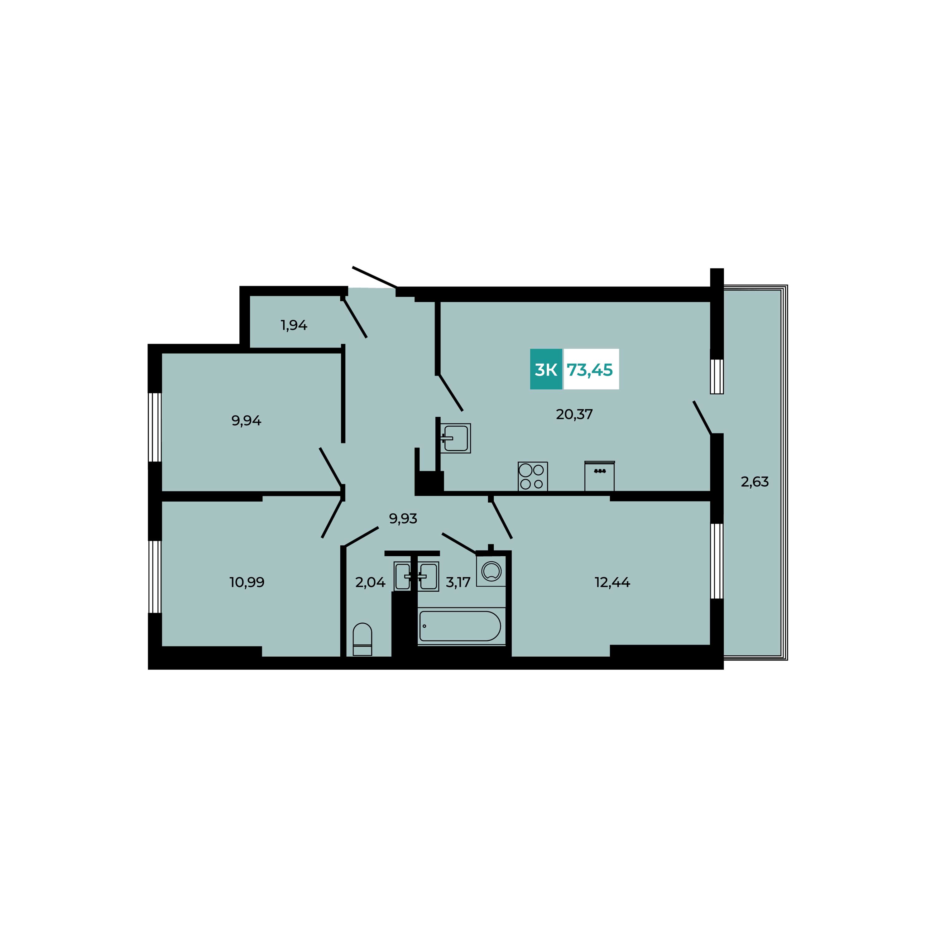 Общая площадь: 73.45м2