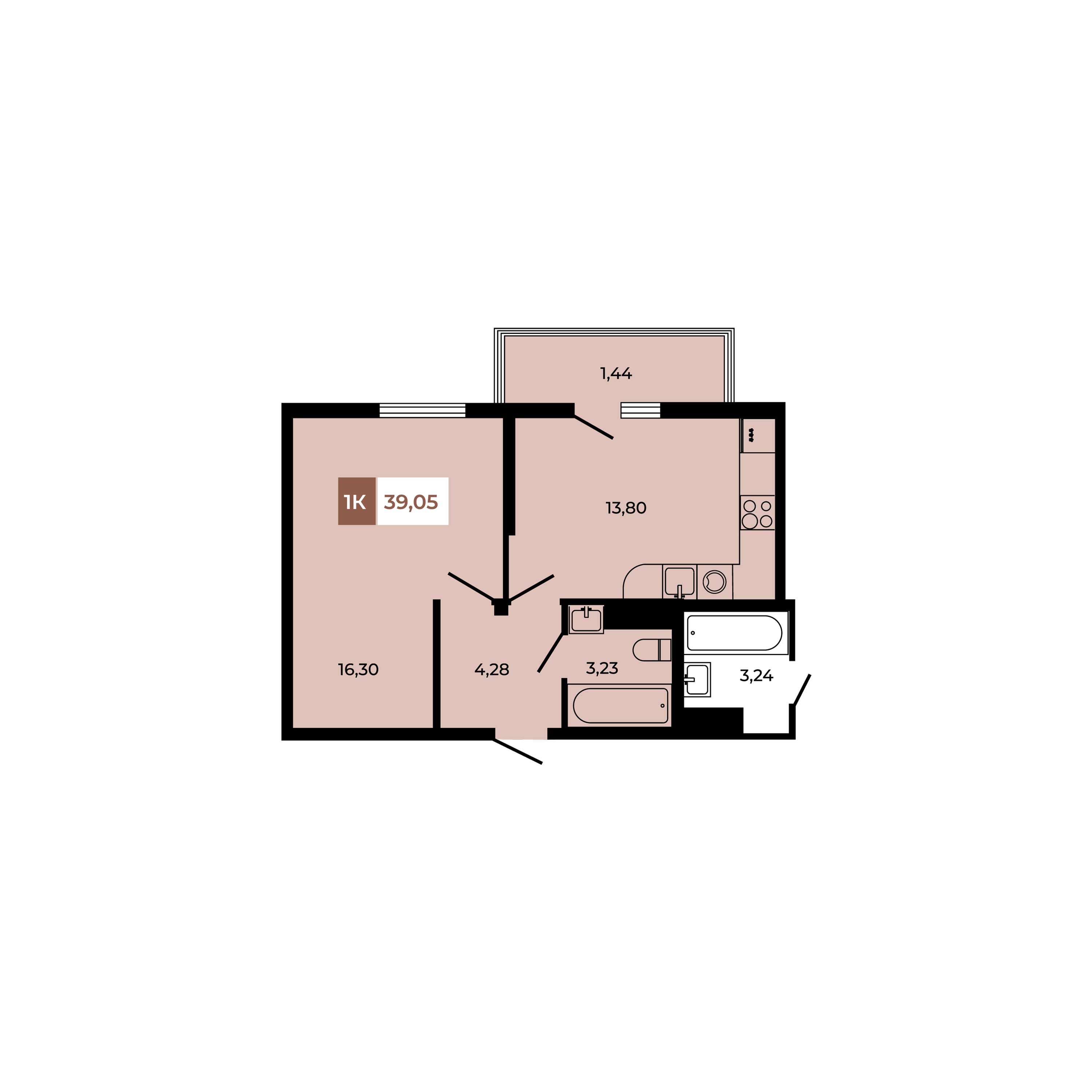 Общая площадь: 39.05м2