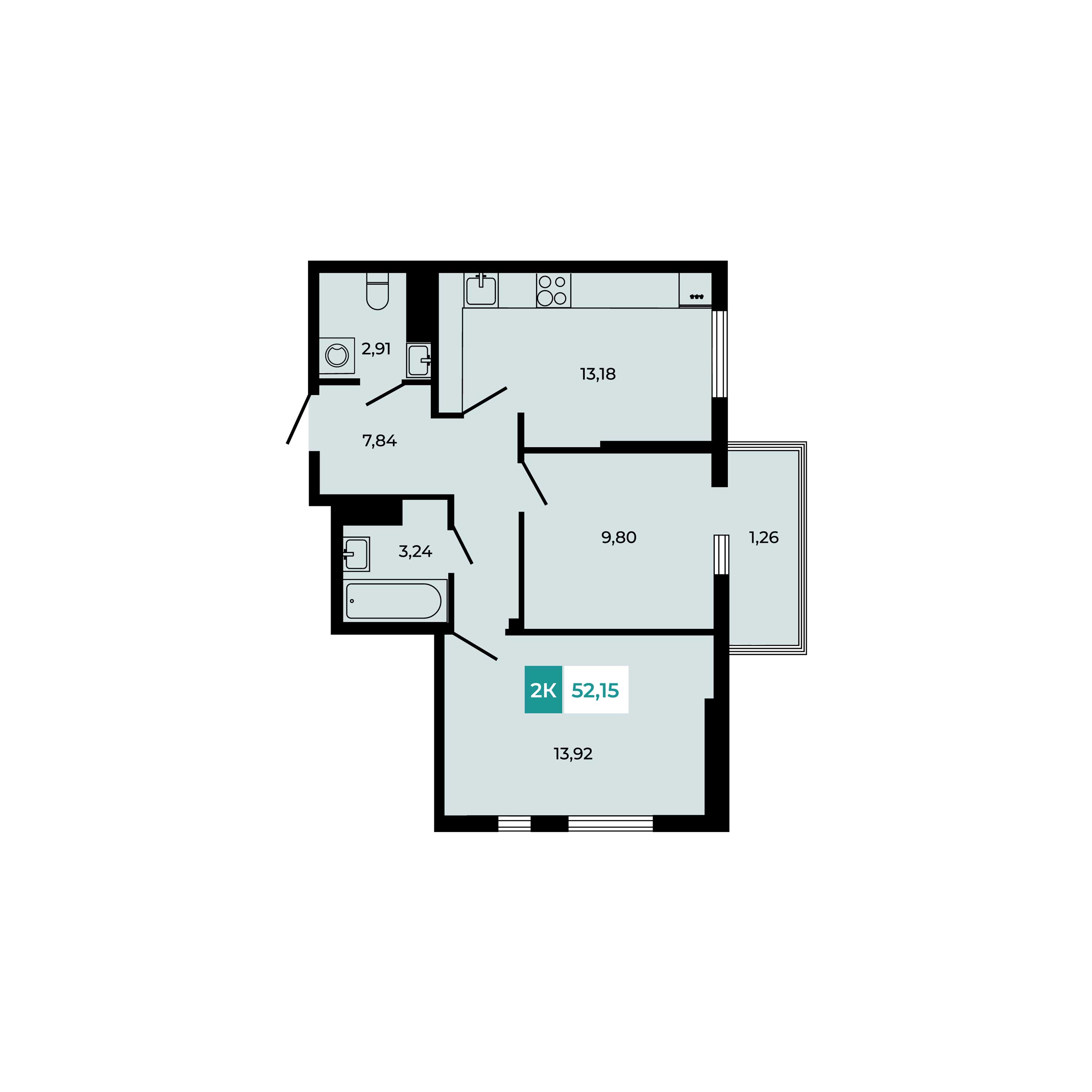 Общая площадь: 52.15м2