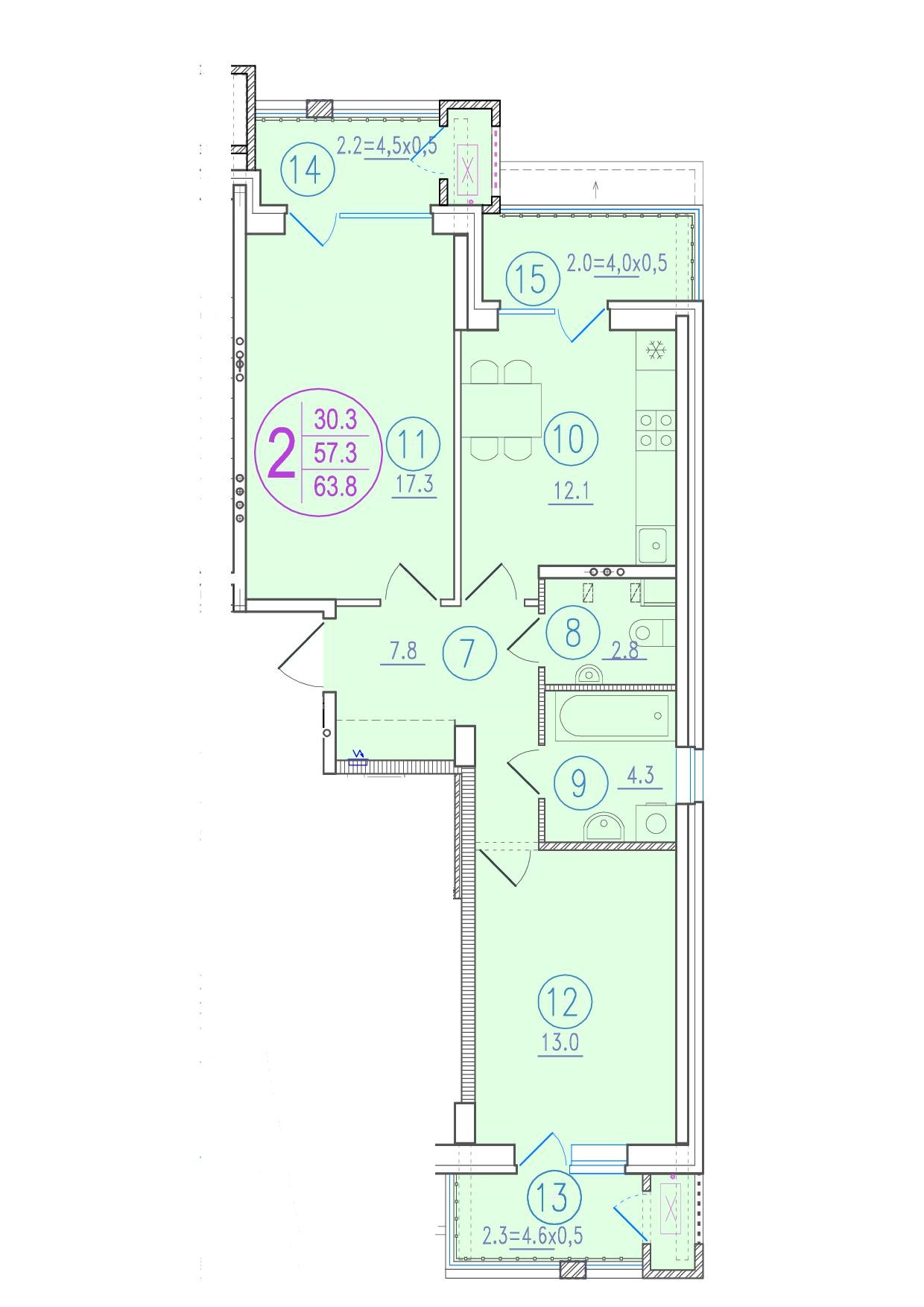 Общая площадь: 63.80м2