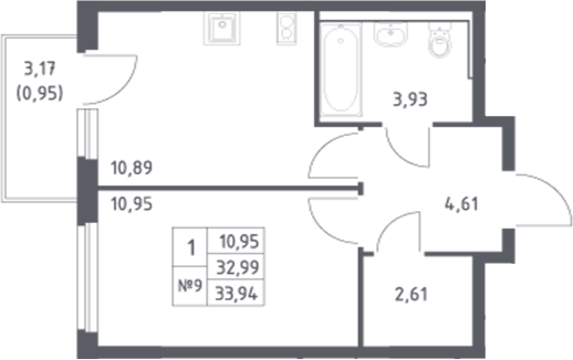 Квартира этаж 8, площадь 33.90 м2