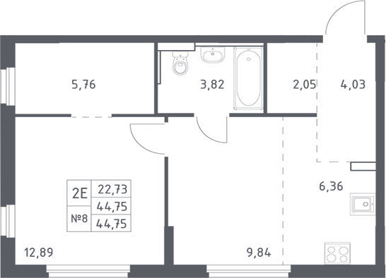 Квартира этаж 13, площадь 44.75 м2