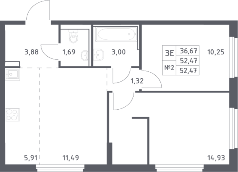 Квартира этаж 2, площадь 52.47 м2