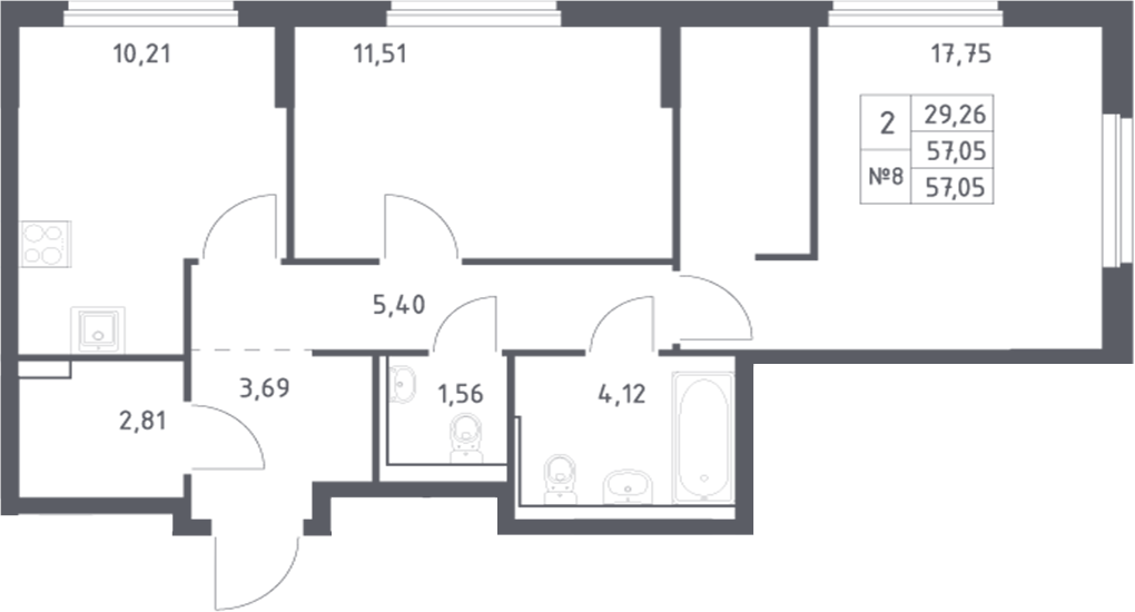 Квартира этаж 5, площадь 57.05 м2