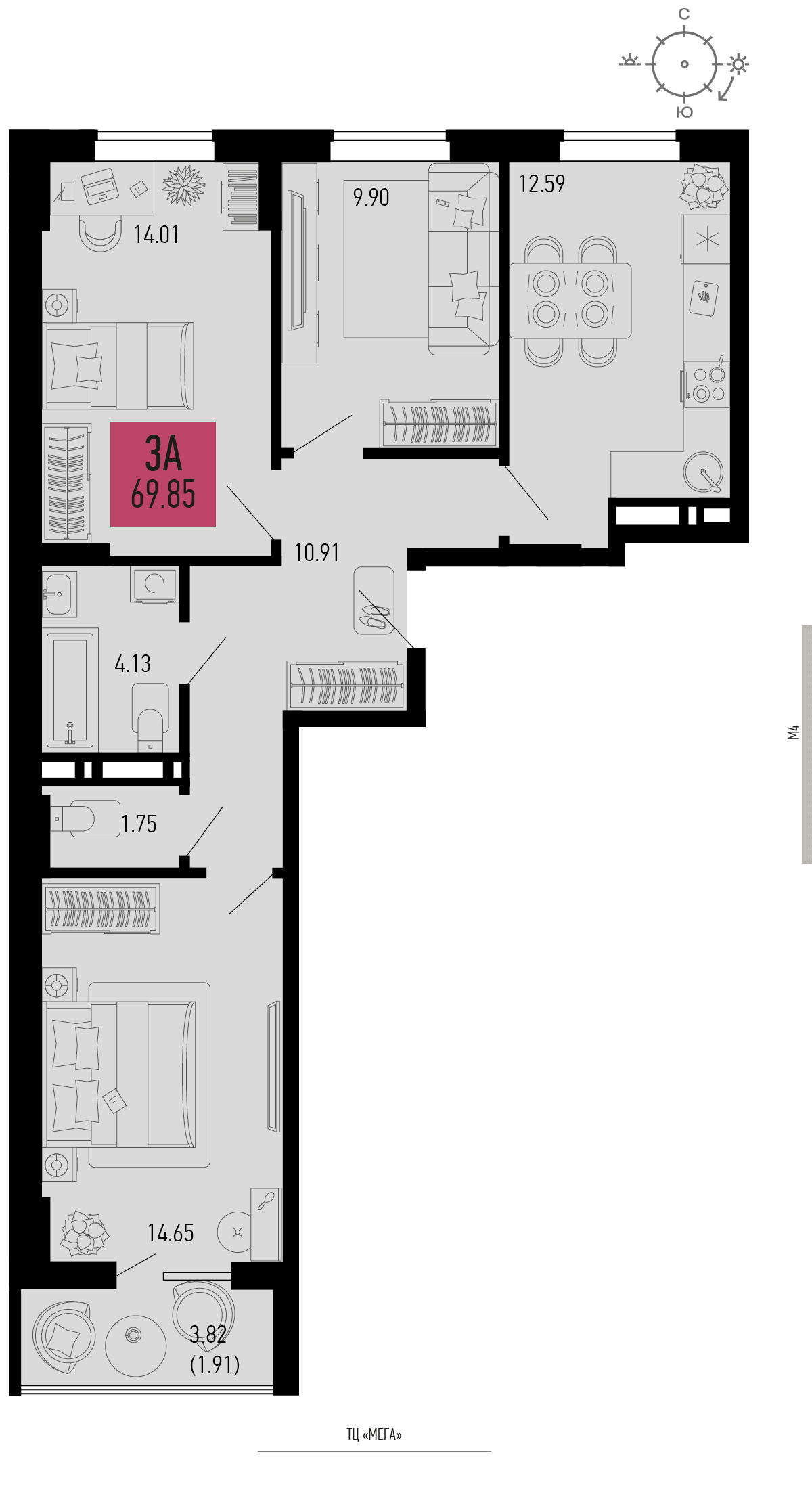 Квартира этаж 3, площадь 69.85 м2