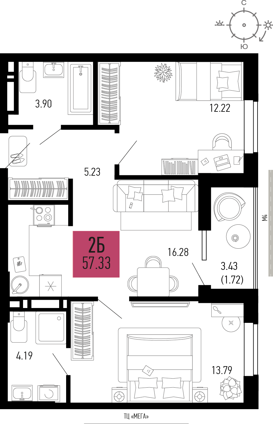 Общая площадь: 57.33м2