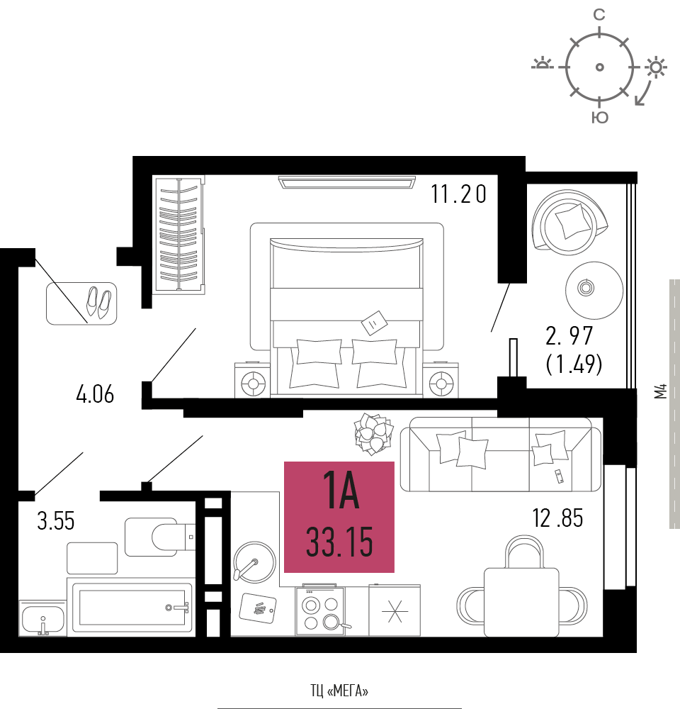 Общая площадь: 33.15м2