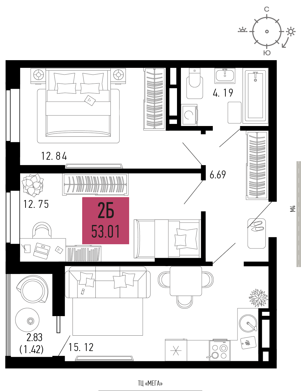 Квартира этаж 12, площадь 53.01 м2