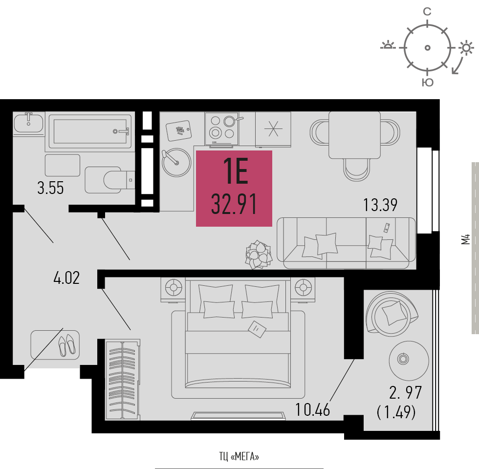 Общая площадь: 32.91м2