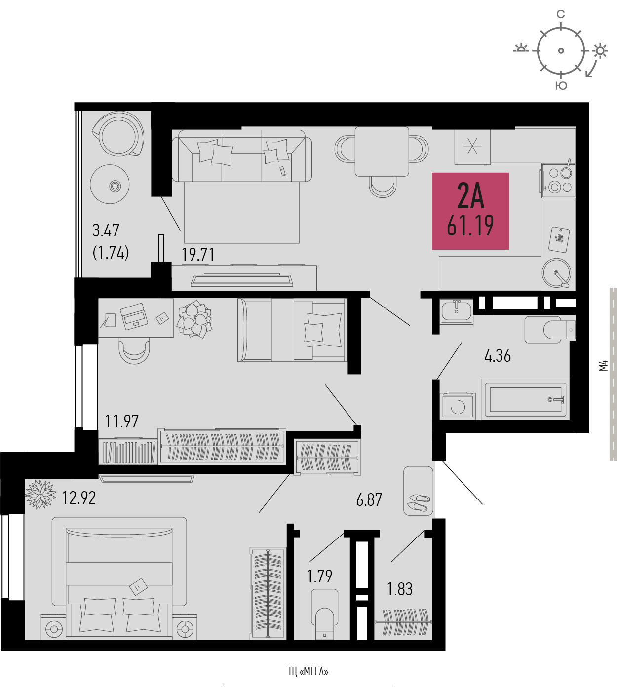 Общая площадь: 61.19м2