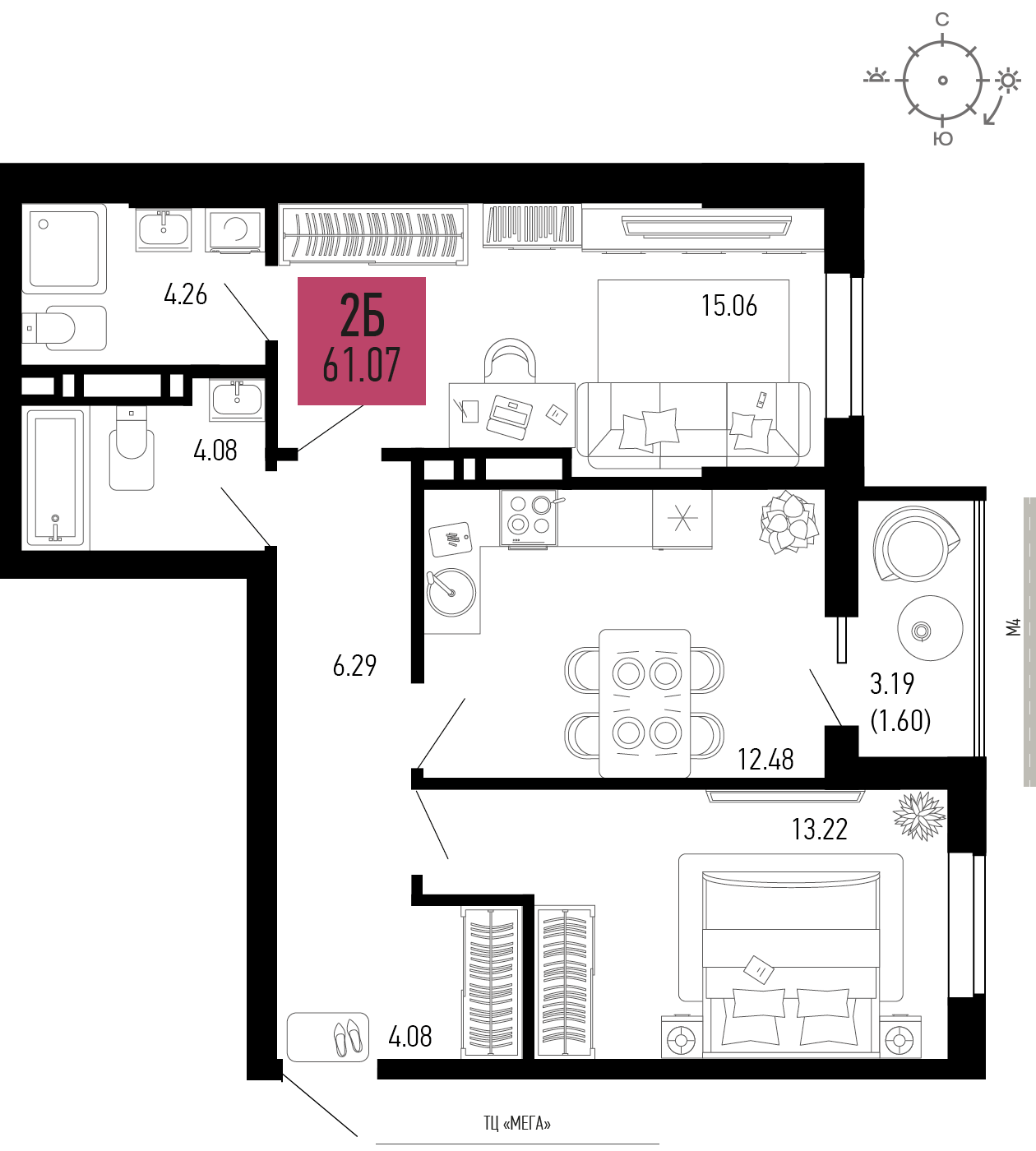 Общая площадь: 61.07м2