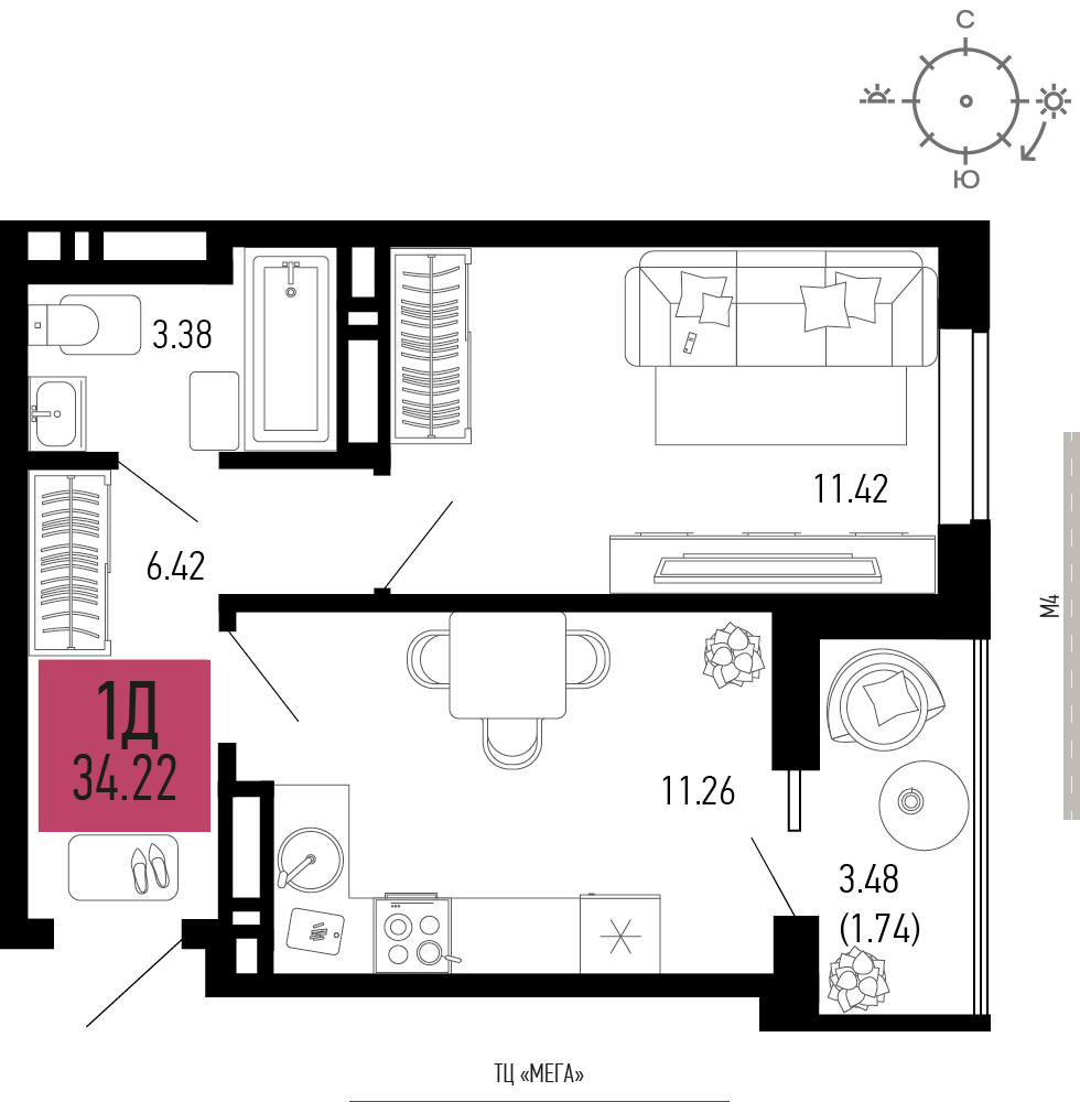 Общая площадь: 34.22м2