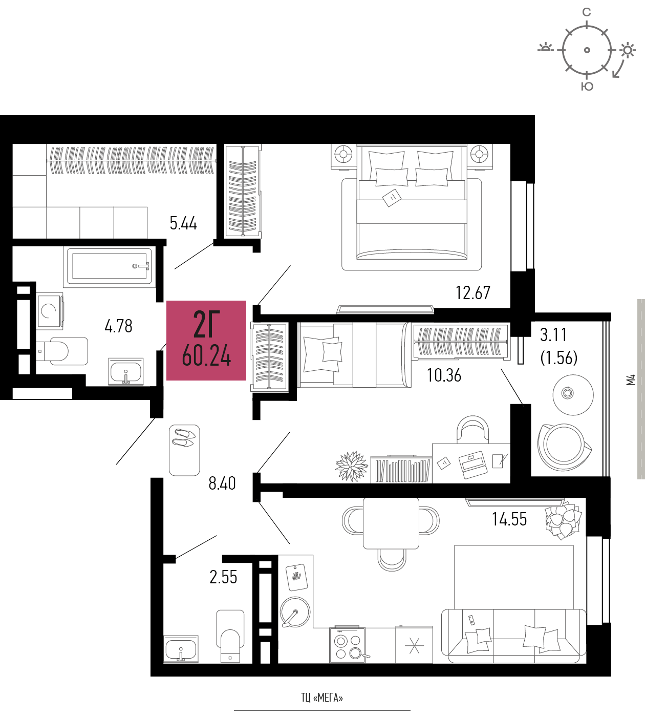 Общая площадь: 60.24м2