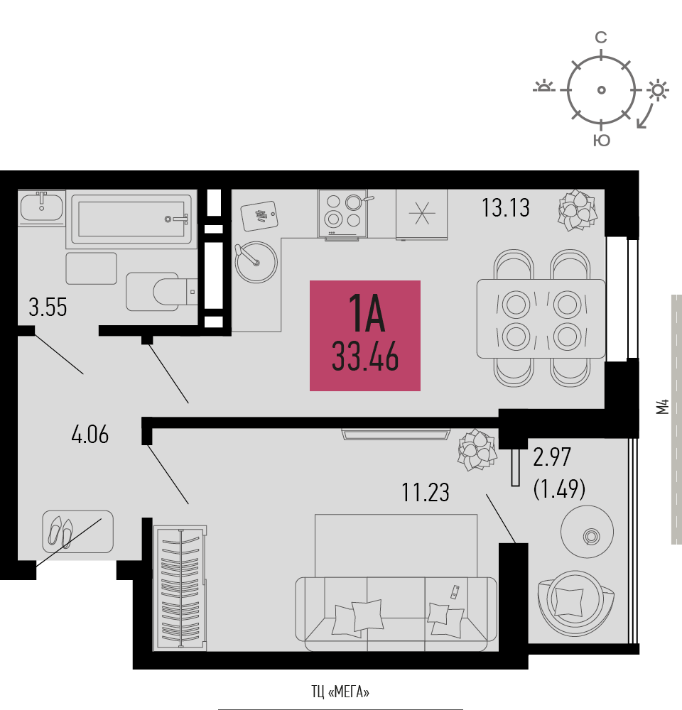 Общая площадь: 33.46м2