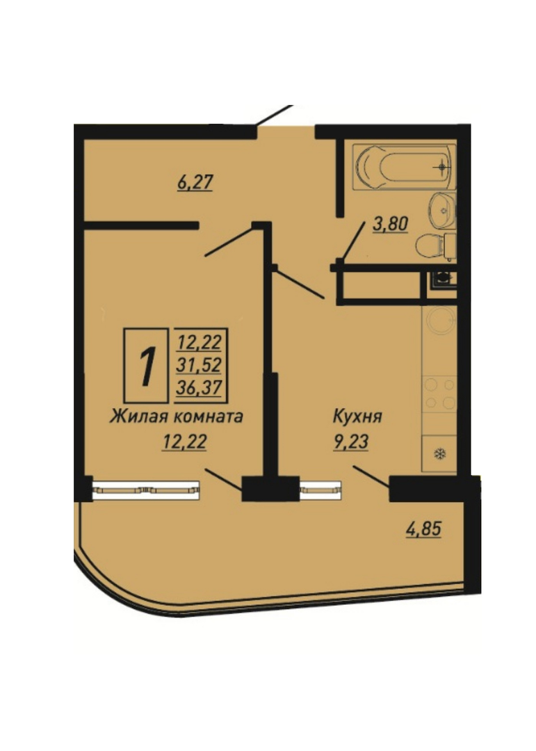 Общая площадь: 36.37м2