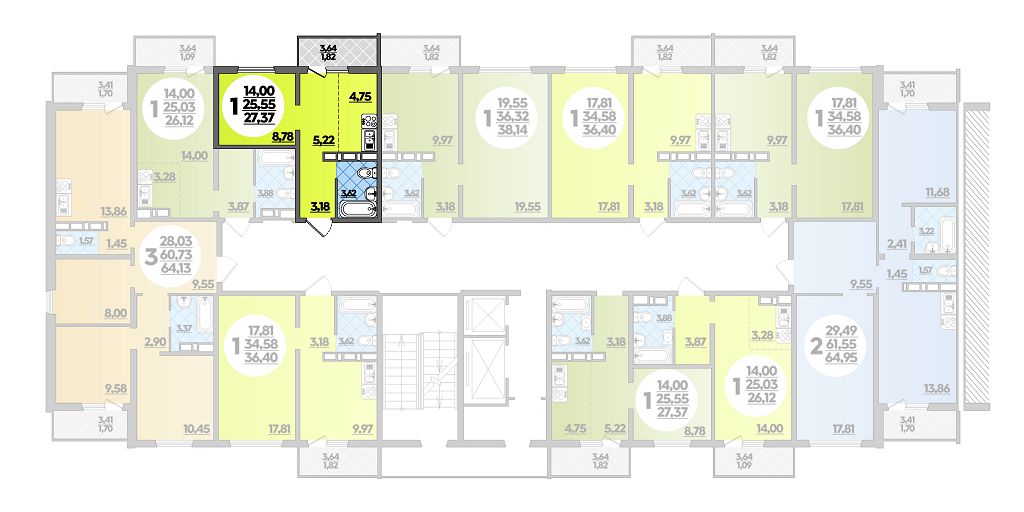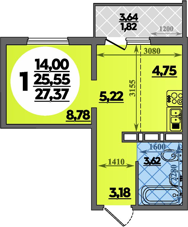 Квартира этаж 1, площадь 27.37 м2