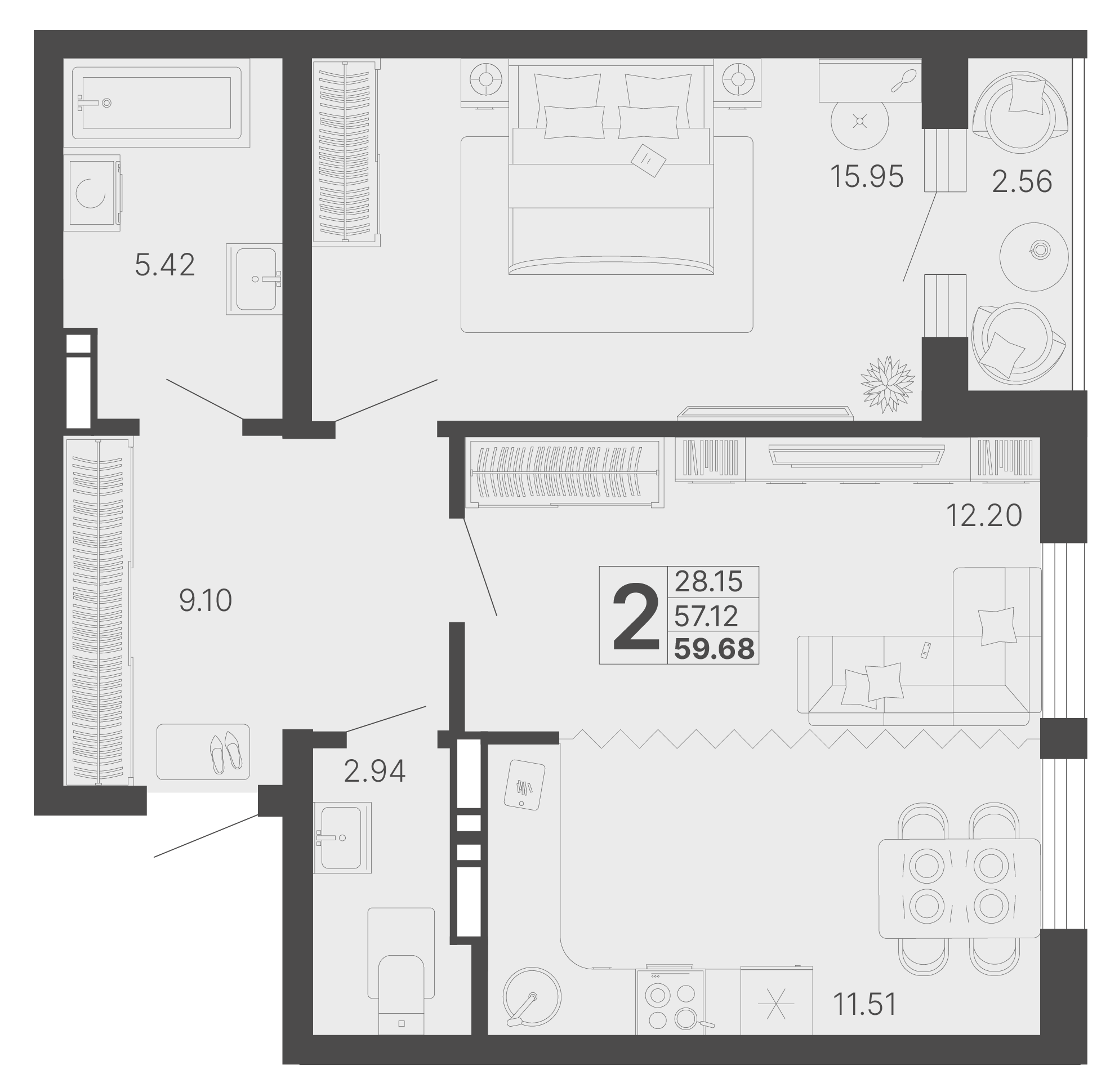 Общая площадь: 58.40м2