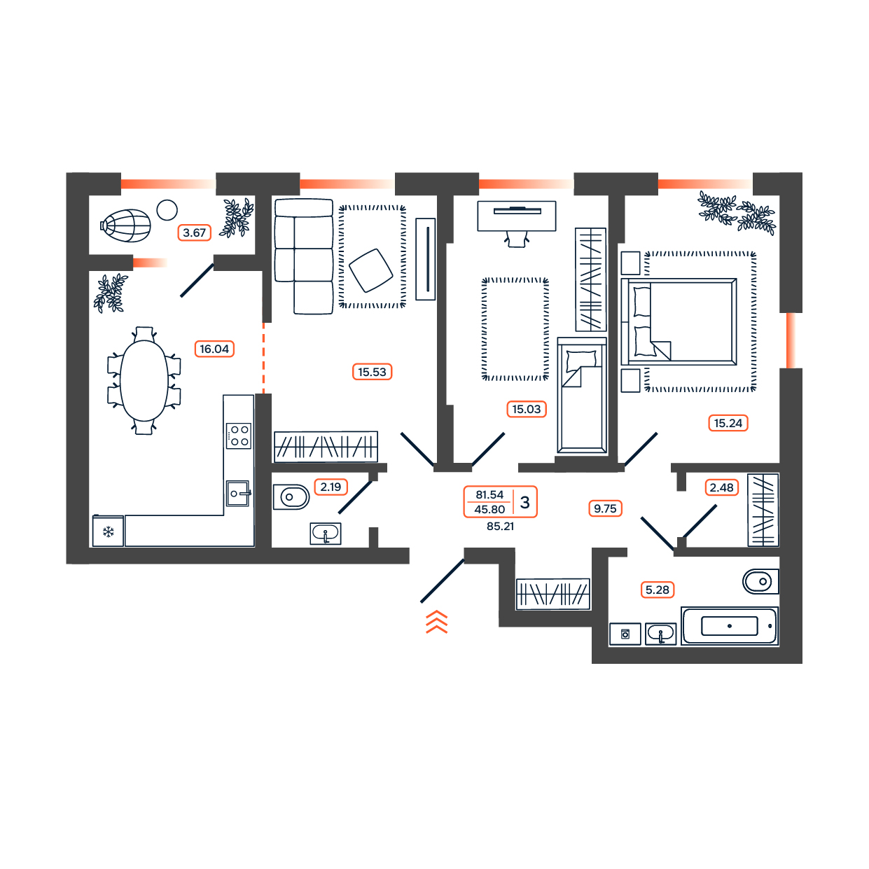 Общая площадь: 85.21м2