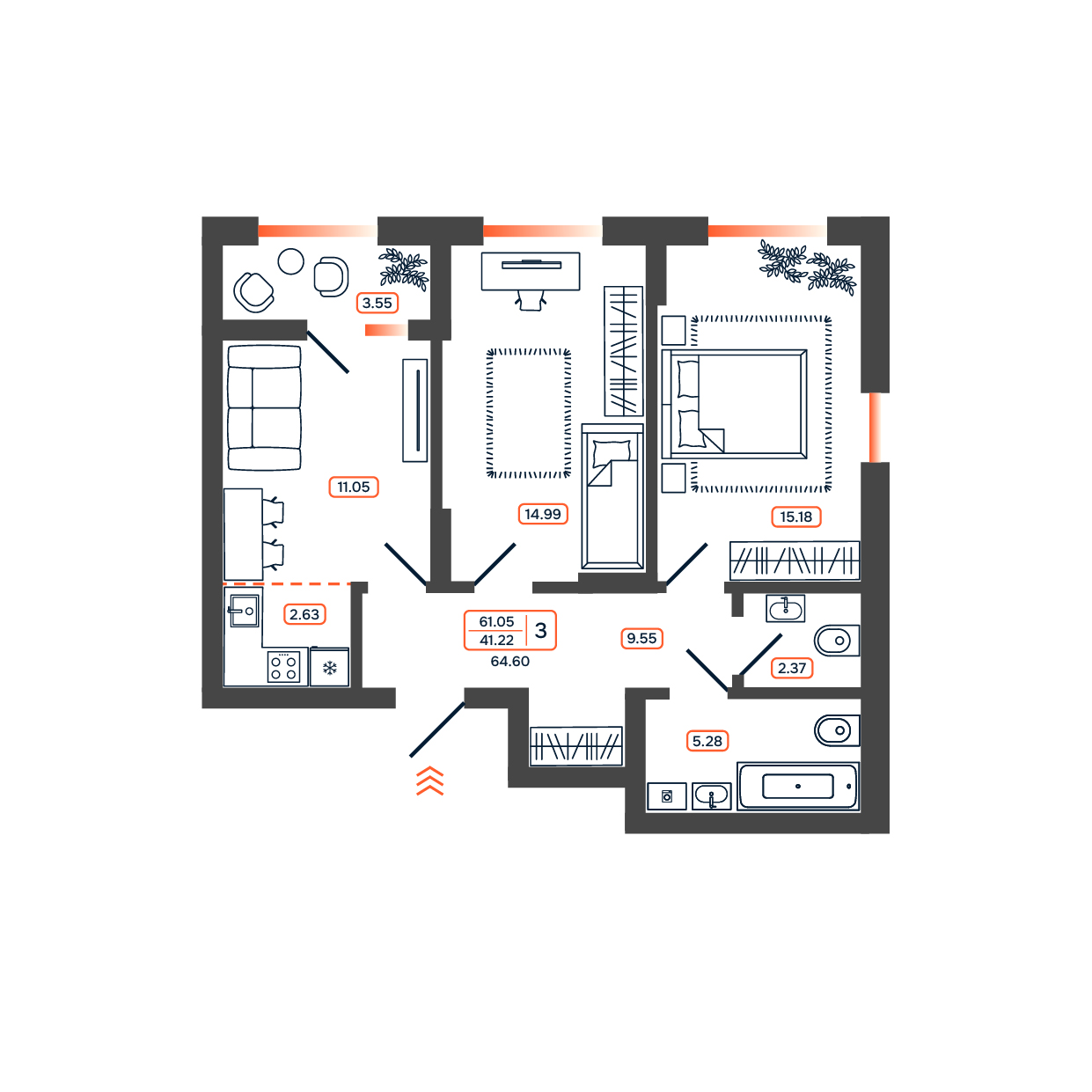 Общая площадь: 64.60м2