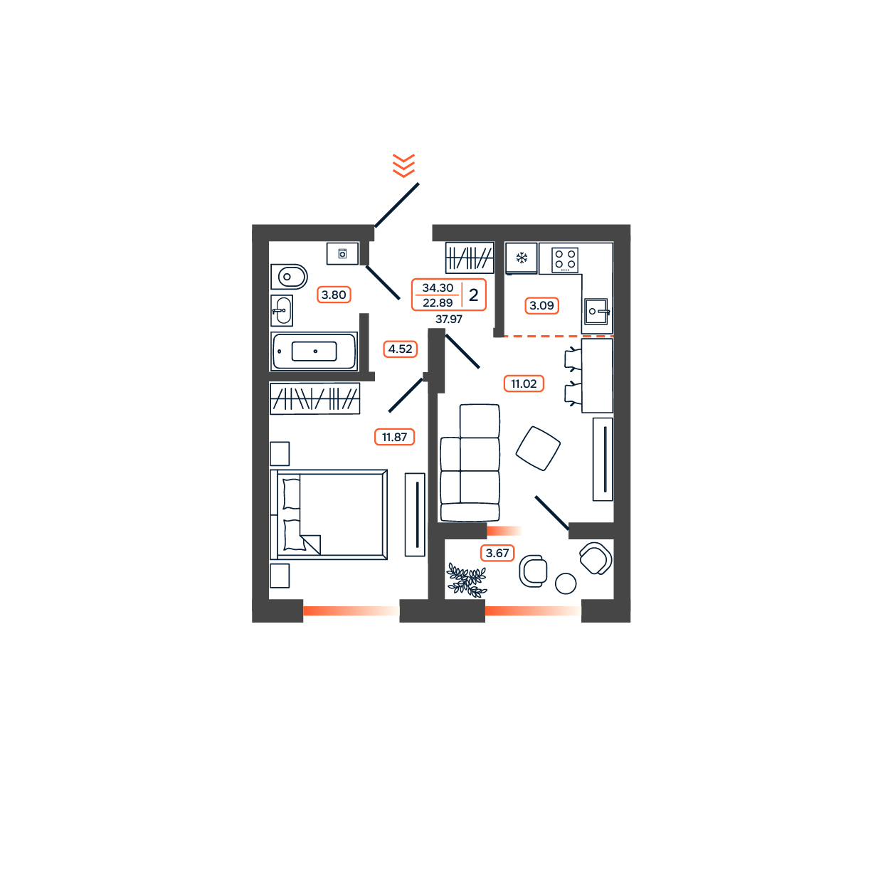 Квартира этаж 2, площадь 37.97 м2