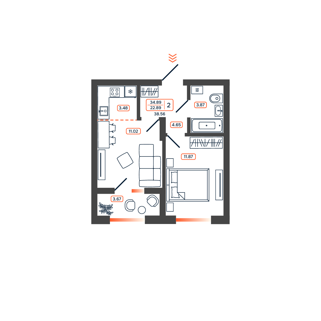 Квартира этаж 1, площадь 38.56 м2