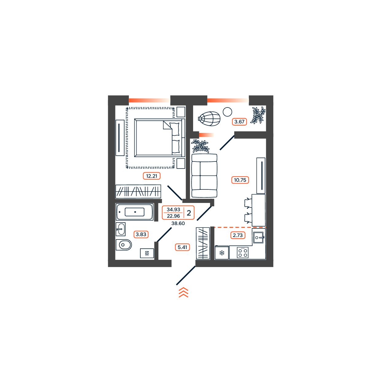 Общая площадь: 38.60м2