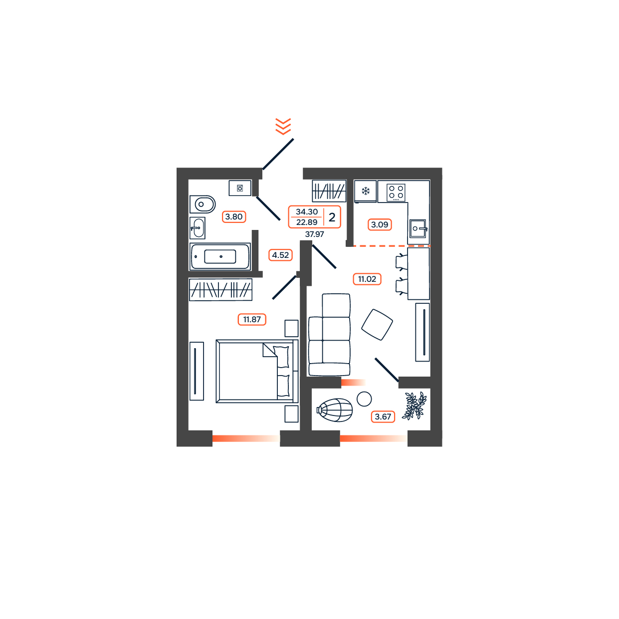 Общая площадь: 37.97м2