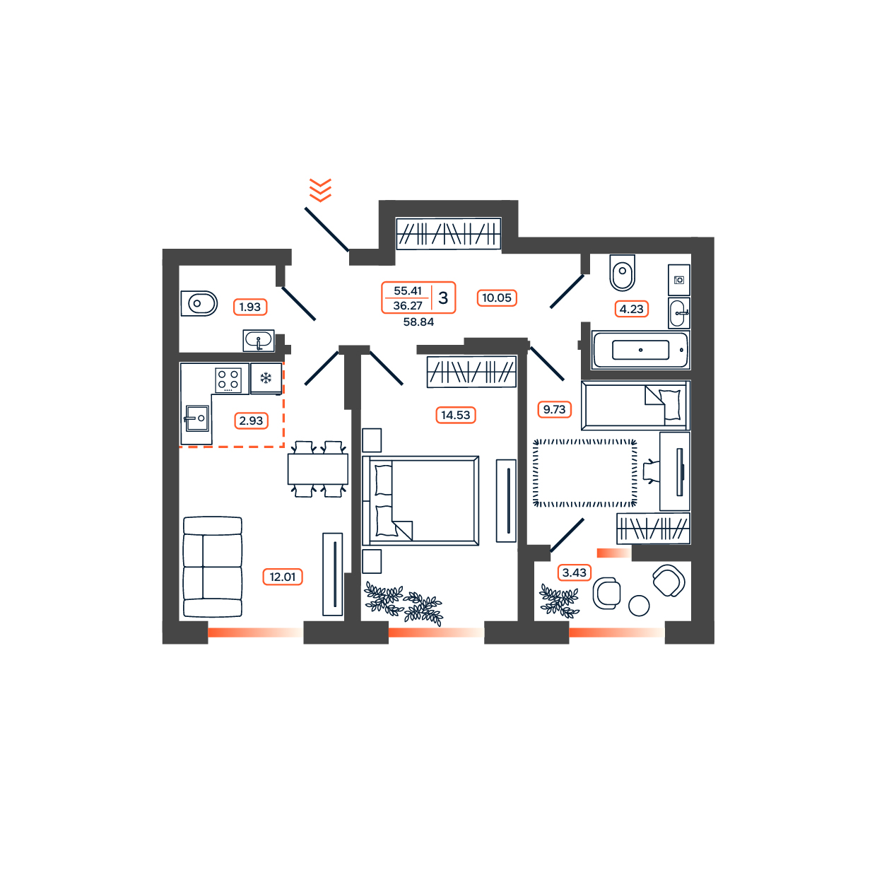 Квартира этаж 9, площадь 58.84 м2