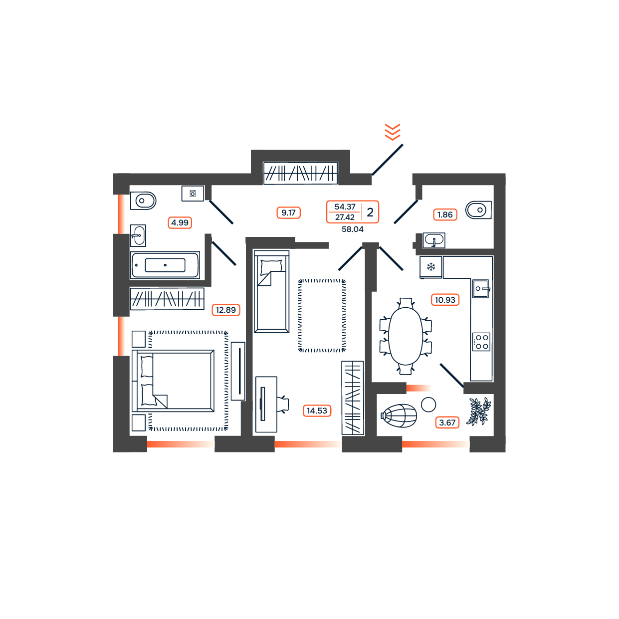 Общая площадь: 58.04м2