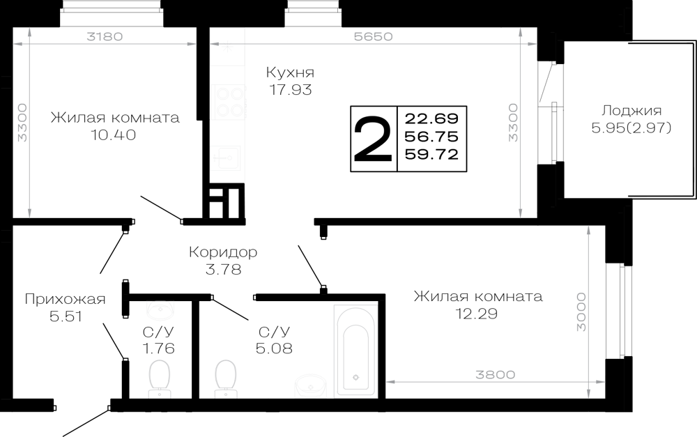 Общая площадь: 59.72м2