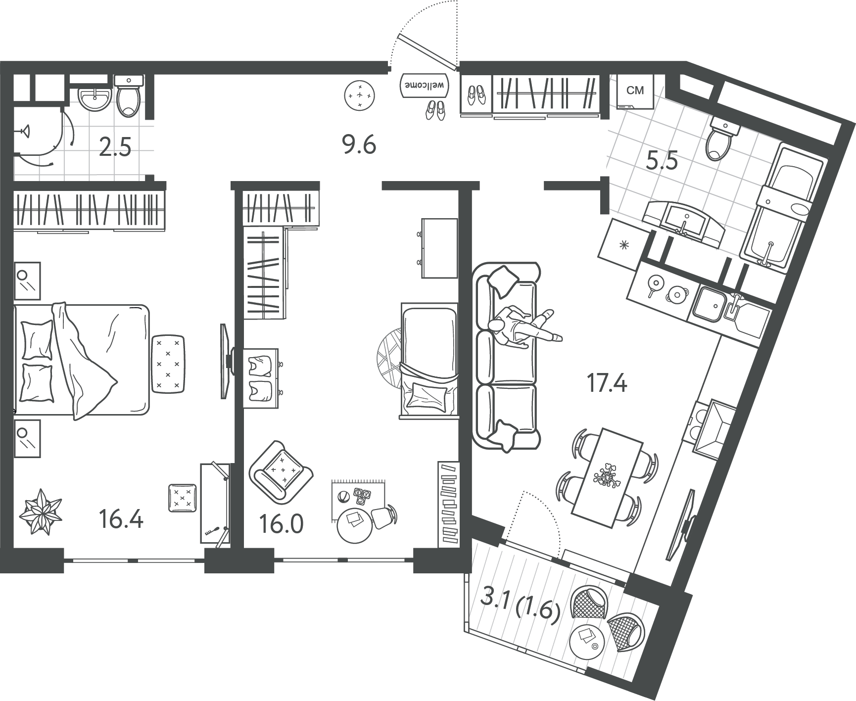 Общая площадь: 61,60 м2