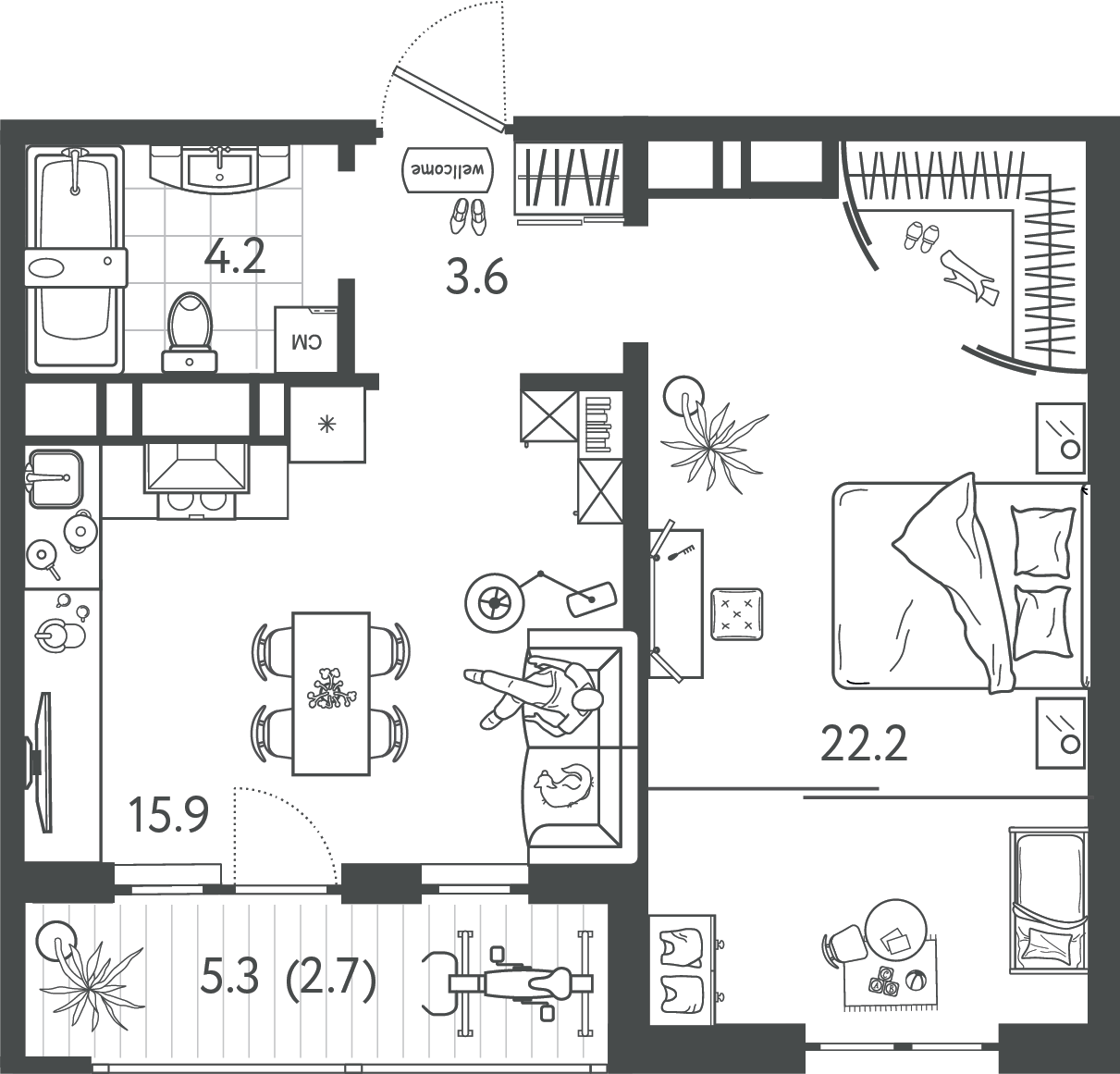 Общая площадь: 47.55м2