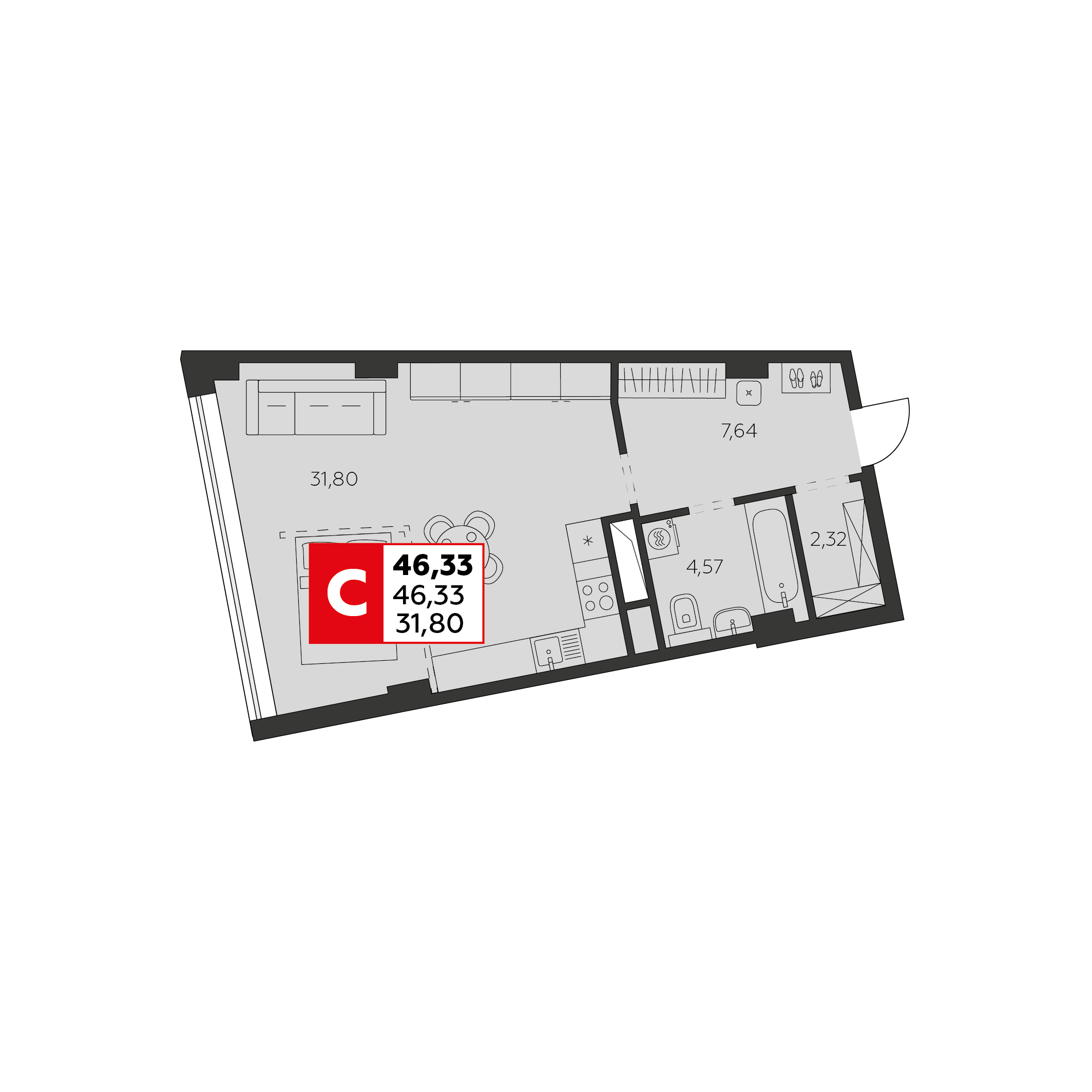 Общая площадь: 46.33м2
