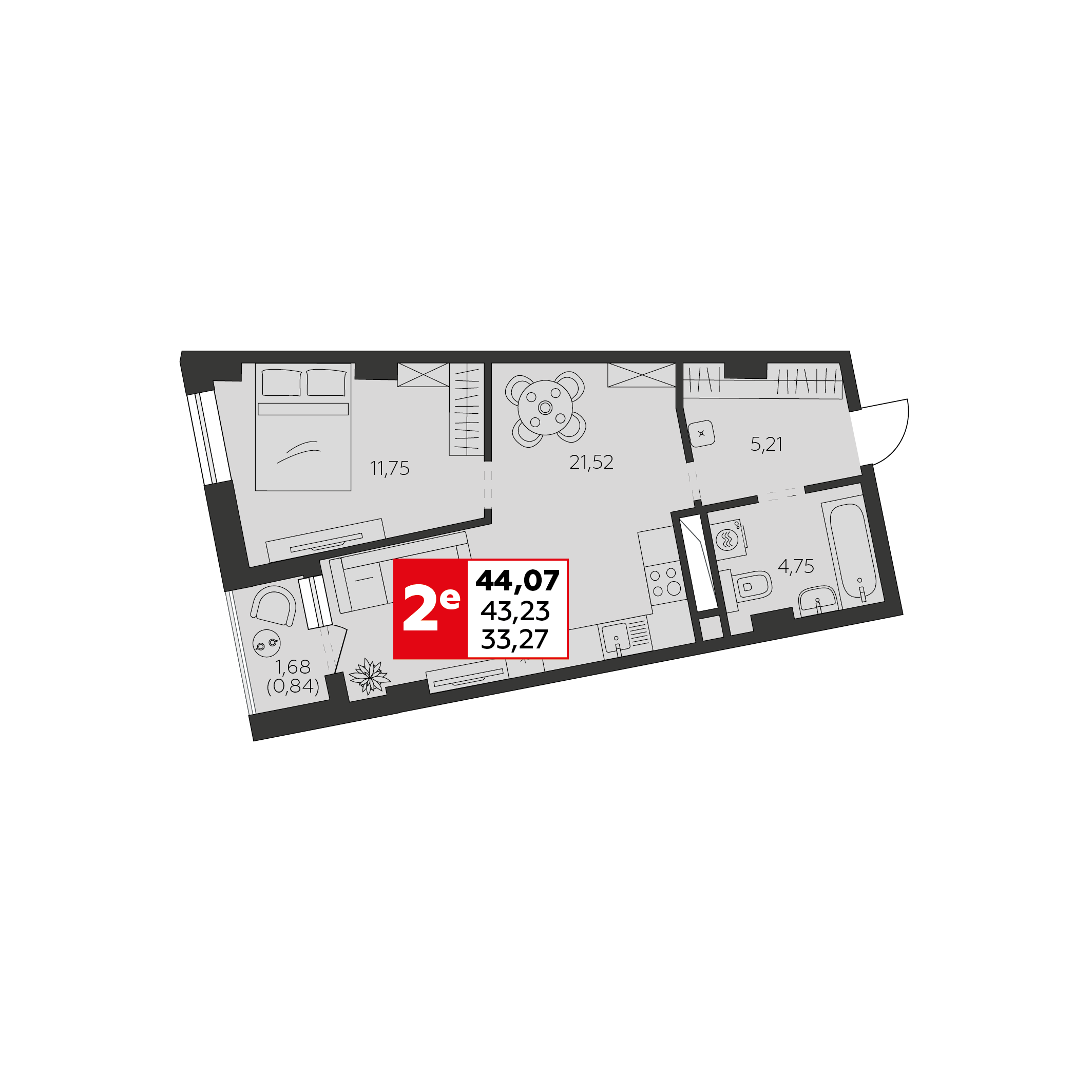 Общая площадь: 44.07м2