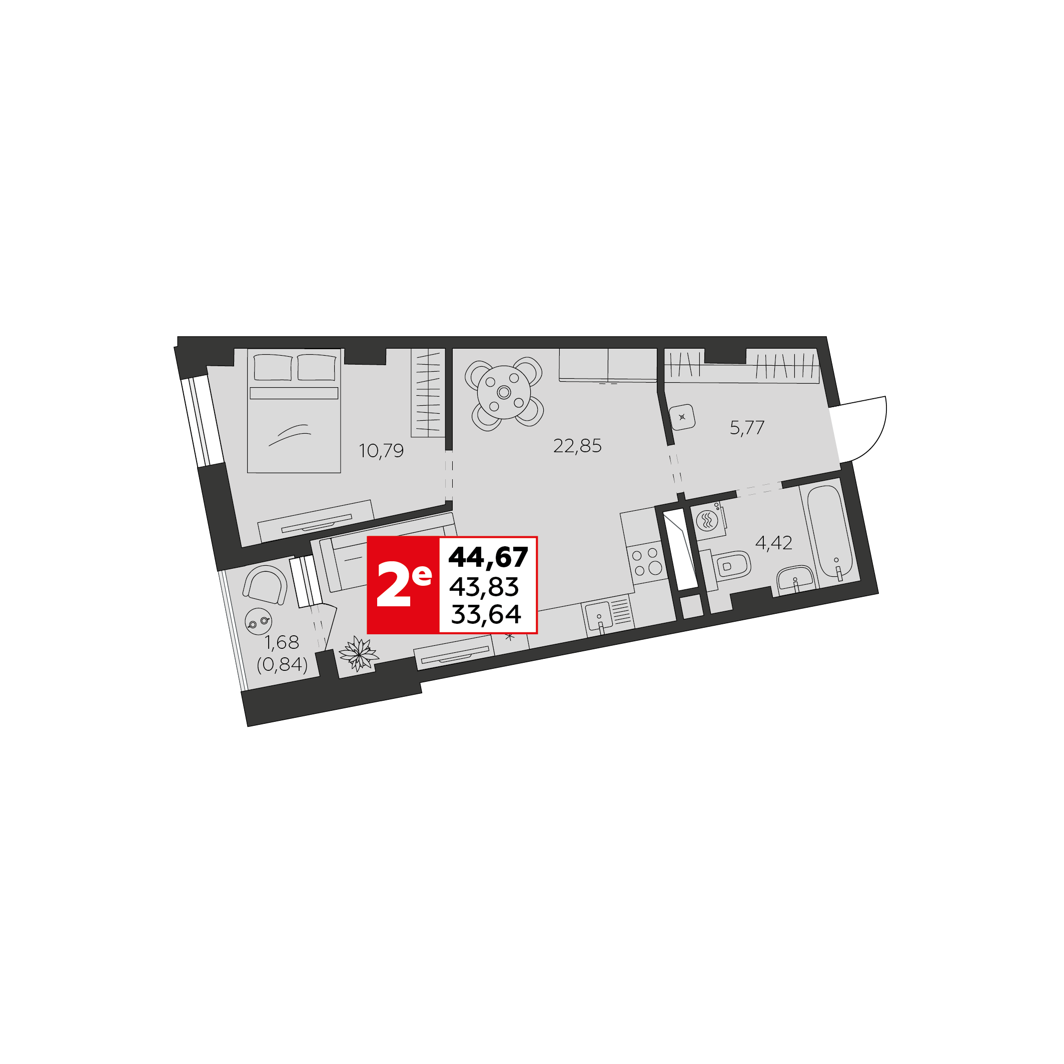 Квартира этаж 2, площадь 44.67 м2