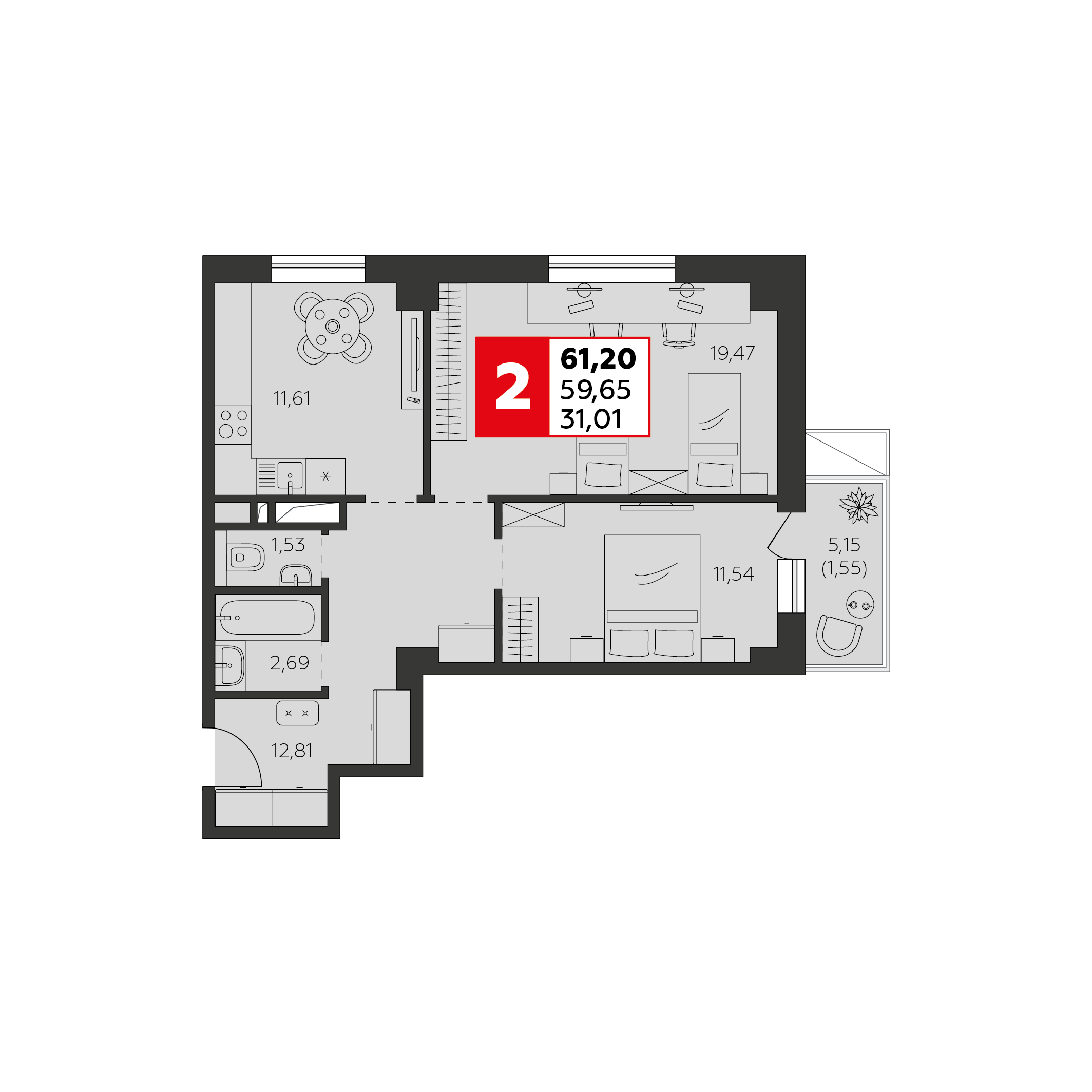 Общая площадь: 61.20м2