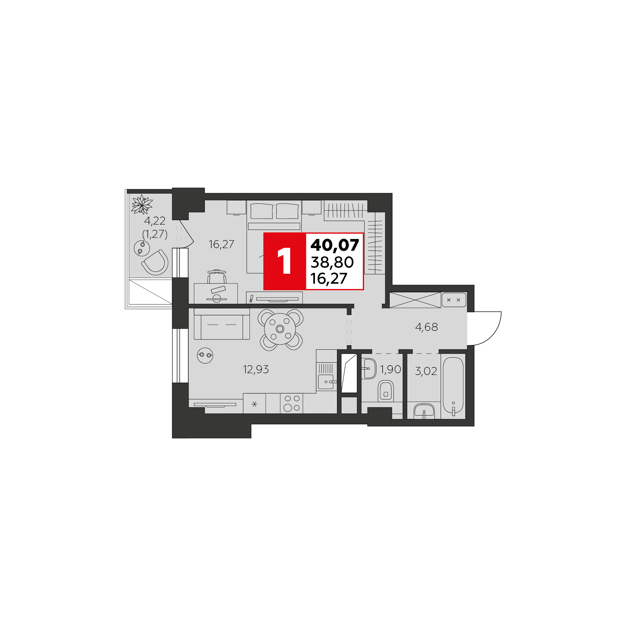 Общая площадь: 40.07м2